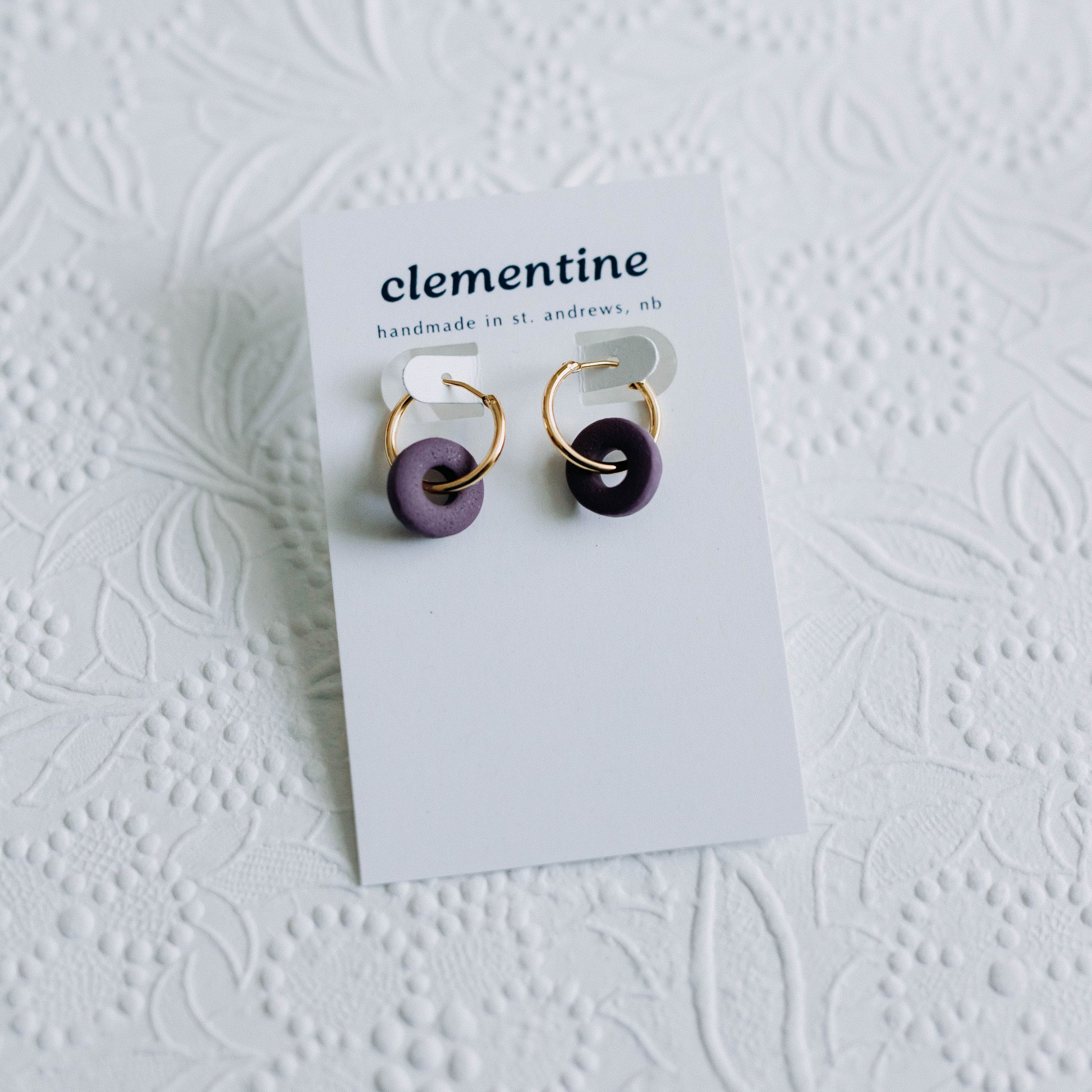 These petite hoop earrings feature handcrafted polymer clay charms embedded with real grains of sand from St. Andrews. The sand adds a subtle, natural texture—giving each pair quiet character without overpowering their simple, wearable design. Suspended from small brass hoops, they’re lightweight, versatile, and easy to style for everyday wear, while carrying a small connection to a special place.