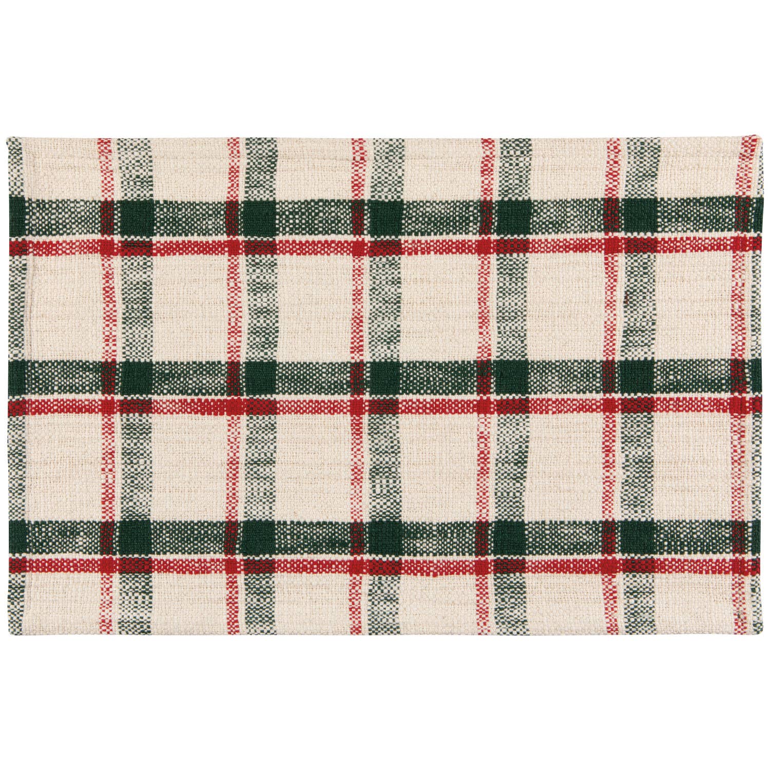 Glimmering with a hint of holiday magic, a rustic Noel plaid placemat gets a festive-forward upgrade with metallic thread woven throughout.